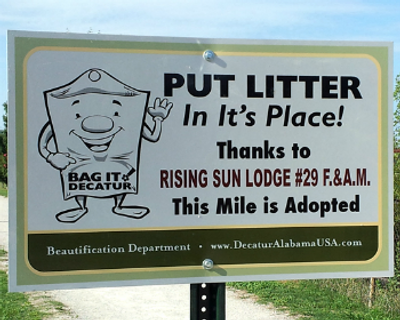 Adopt-An-Area: In cooperation with the City of Decatur Landscape & Beautification Department, our Lodge has been approved for and granted a perfect Adopt-An-Area. The area is designated to be on Central Parkway from the Decatur Animal Shelter to Clearview Street around Wilson Morgan Lake. Two PUT LITTER In It's Place! Thanks To Rising Sun Lodge #29 signs were erected at each end of our area Wednesday, July 18, 2012. In a continuing effort to increase public awareness, community involvement and civic contributions, this area will give us very good exposure. It's a beautiful, safe walking trail in a very high traffic area. Yes! This will be a family event - the more the merrier! Don't forget the duck and goose food! In August 2012, we received a letter of appreciation from Mrs. Yvonne Krenkle, Director of Decatur Beautification Department, for the great job we are doing keeping OUR area clean.