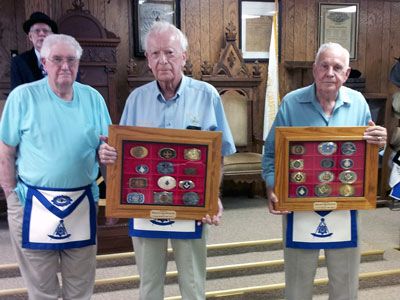 Under the watchful eye of Worshipful Master, Brother Donald Foster, a Masonic belt buckle collection is donated to the Lodge on August 12, 2013 by Brother Archie Hampton, PM. (L-R) Brother Archie Hampton, PM, and Lodge Trustees Brother Maurice Means, PM and George Mills, PM.