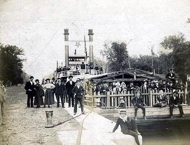 Riverboat with passengers at Lock "A" on the Tennessee River, 20 miles west of Decatur, Alabama. The passengers are on a trip sponsored by the Masonic Lodge on May 17, 1895.